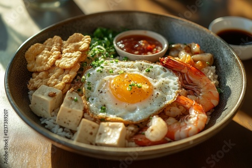 seafood, rice, bowl, tofu, egg, shrimp, lunch, eatery, food, healthy, delicious, asian, cookery, meal, breakfast, dinner, plate, sunlight, morning, tasty, fresh, protein, vegetarian, diet, epicure, eat, eating, deliciously, cook, cooking, receipe, prepare, preparation, dish, epicure