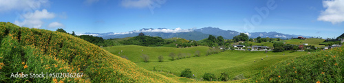 asia, highland, wilderness, field, nature, mountain chain, meadow, hill, asian, city, town, countryside, exterior, no people, natural, flower, blossom, bloom, lily, orange, mature, daylily, summer, mountain, farm, agriculture, blue skies, cloud, crop, daytime, grass, green, plant, prairie, sky, sunny, vegetation, landscape, panorama
