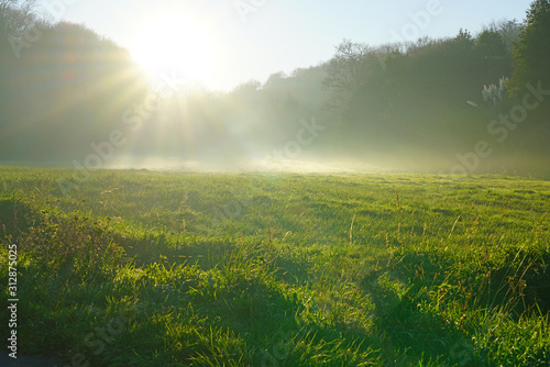 tree, light, nature, brittany, environment, field, fog, france, grass, green, landscape, mist, mysterious, ray, sun, sun ray