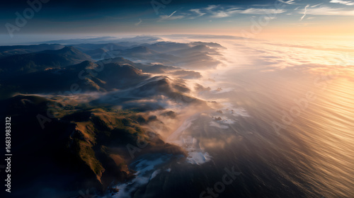 Sunrise aerial view of coastal mountains and ocean with golden mist and dramatic clouds