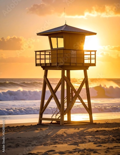 sunrise, beach, ocean, wave, gold, light, morning, sky, horizon, coast, water, sand, tower, lookout, guard, calm, scenic, tranquil, nature, vacation, travel, beautiful, photo, coastal