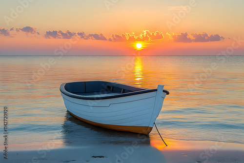 boat, sunset, ocean, beach, sunrise, calm, peaceful, travel, water, sea, sky, nature, tranquil, serene, morning, light, gold, horizon, summer, relaxation, vacation, holiday, escape, peace, serenity, solitude, coast, waterfront, picturesque, idylli, beautiful, scenic, view, landscape, calmness, discovery, adventure, freedom, joy, happiness, well-being, hope