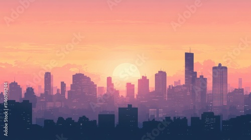 sunrise behind urban skyline, silhouettes of high-rise buildings, soft pink and orange hues filling sky, peaceful and serene transition to day