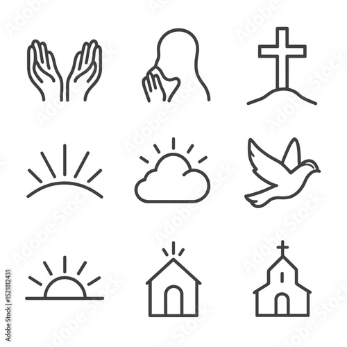 sunrise, devotion, icon, outline, icon, set, devotional, imagery, open, hand, praying, silhouette, light, cross, hilltop, horizon, ray, hope, glowing, cloud, dove, flight, rising, sun, chapels, line