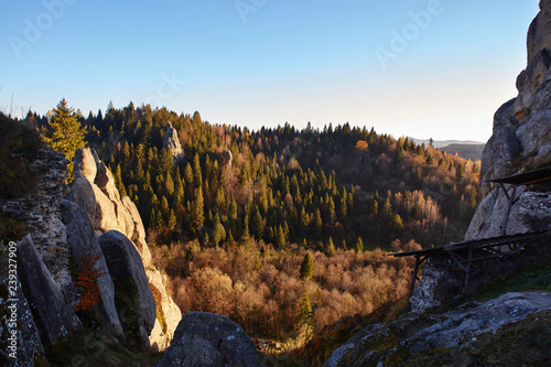 sun, sunrise, cliff, rock, forest, wood, sky, rise, pine, ridge, national park, morning, autumn, orange, green, colours, amazing, beauty, beautiful, nature, landscape, hiking, vacation, new day, tour, ukraine, excursion, view, scene, scenic