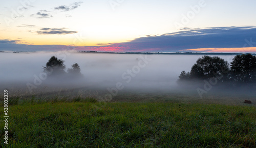 Sunrise in the Biebrza National Park. Foggy morning. The sun is shining through the fog. Trees in the fog. September in Podlasie