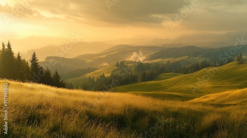 Sunrise in the Carpathian mountains, with golden light spreading across the grassy landscape and highlighting the rolling hills.