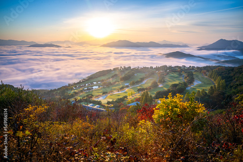 landscape, autumn, korea, green, view, mountain, beautiful, scenic, scenery, sunrise, forest, sport, maple, fairway, korean, golf course, sport, course, grass, golf, aerial view, field, morning, bunker, season, aerial, nature, hill, background, south korea