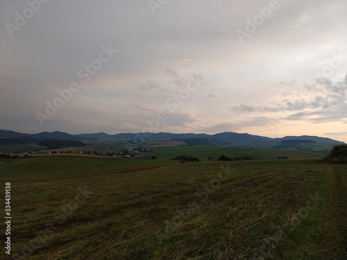 Sunrise or sunset over the hills and meadow. Slovakia
