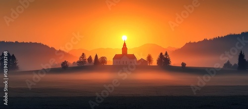sunrise, sunset, church, chapels, building, architecture, landscape, nature, scenery, field, fog, mist, sky, sun, morning, light, gold, orange, tree, hill, mountain, rural, tranquil, peaceful, serene, calm, beauty, picturesque, idylli, christian, faith, hope, spirituality, religion, travel, destination, view, panorama, horizon, dawn, dusk, atmosphere, mystical, magical, majestic, awesome, stunning, breathtaking, spectacular