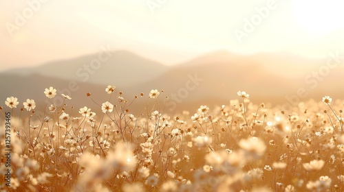 sunrise, flower, mountain, field, nature, peaceful, landscape, outdoors, calm, beautiful, wildflower, gold, light, scenic, spring, summer, horizon, view, meadow, sunlight, tranquil, warm, morning, floral, photo, natural, beauty, image, background, bloom, springtime, summer, rural, delicate, soft, pale, warmth