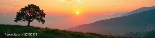 Sunrise over Carpathian rural landscape with tree on grassy meadow, foggy valley, and mountain ridge in distance, morning light, Carpathian