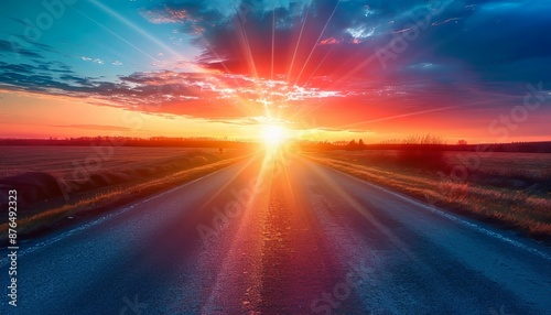 Sunrise over empty road, sun illuminates asphalt against colorful dawn sky Evokes calm
