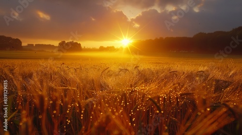 Sunrise Over Fields: Capture the tranquility of a sunrise over fields with golden light, dewy grass, and peaceful scenery, suitable for nature blogs