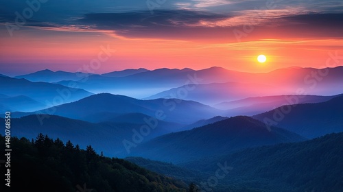 sunrise, mountain chain, hazy, pink sky, orange sky, tree, foreground, view, landscape, nature, scenic, fog, mist, horizon, sky, cloud, atmosphere, mountain peak, forest, wilderness, travel, vacation, destination, morning, dawn, sun, light, shadow, silhouette, tranquil, peaceful, serene, beautiful, idylli, panorama, vista, aerial view, hill, ridge, summit, overlook, over