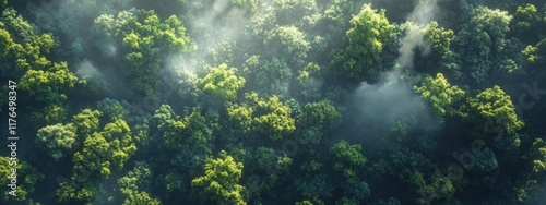 Sunrise Over Lush Rainforest Canopy, vibrant greenery illuminated by dawn light, showcasing the rich biodiversity and natural beauty of the ecosystem