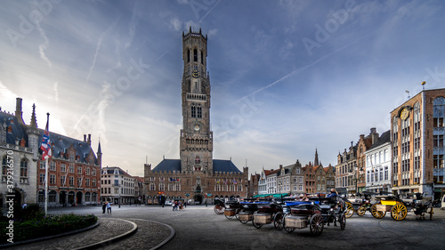 Sunrise over Market Square in the center of Bruges with the may Historic Buildings and the famous Belfry Tower which was built in 1240 and restored from a fire in 1280