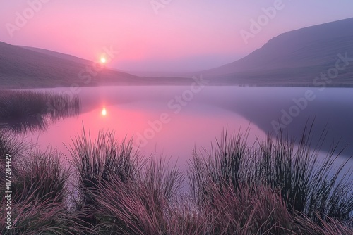 Sunrise over misty mountain lake with vibrant reflections and foreground grasses