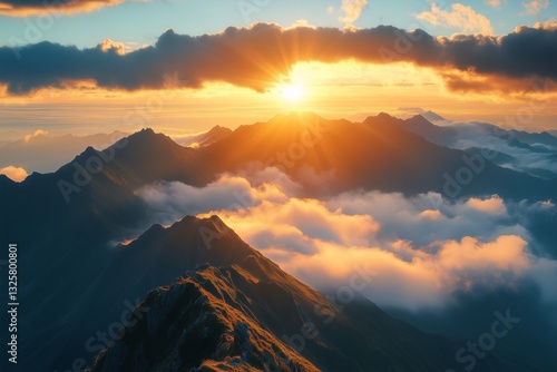 sunrise, mountain, cloud, sunlight, sky, landscape, nature, scenery, peak, horizon, morning, dawn, sunbeam, majestic, outdoors, serene, tranquil, atmospheric, heavenly, gold, vista, elevation, summit, ridge, breathtaking, alpenglow, dramatic, expansive, picturesque, natural beauty, peaceful, idylli, mist, adventure, exploration, wilderness, panorama, aethereal, glow, spectacular, untouched, remote
