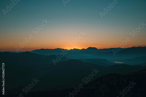 Sunrise over mountains western night twilight dawn peak hill valley sky cloud sunlight landscaped climate atmosphere motion