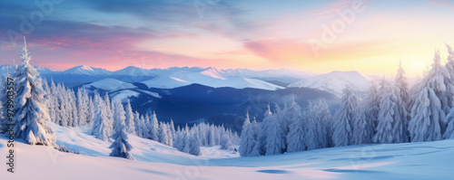 Sunrise over snowy mountain forest landscape