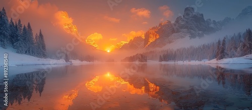 fog, beautiful, icy, blue, cold, calm, view, landscape, white, frost, gold, orange, ray, vista, peaceful, panorama, bright, sun, winter, dramatic, water, horizon, photo, image, peak, sky, mountain, nature, alpine, glacé, majestic, snow, scenic, morning, pine, still, artwork, lake, art, cloud, mist, light, tranquil, tree, dawn, sunrise, serene, grand