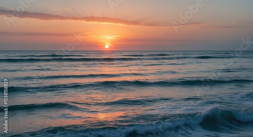 sunrise, ocean, blank space, text, landscape, seascape, serene, tranquil, reflective, warm colors, gradient, calm, nature, background, scenic, silhouette, coastal, sky, beautiful, peaceful, ambience, early morning, soft light, clear sky, vibrant, expansive, stillness, optical, design, graphic, artistic, creative, no people