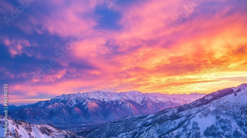 Sunrise over the Wasatch Range, with vibrant skies and snow-covered mountains