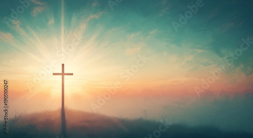 Sunrise with cross on hilltop, spiritual symbol, hope and faith, nature and religion