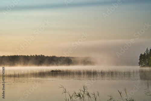 Sunrise with fog forming over a lake in Sweden, at dawn. Romantic silence