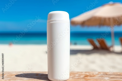 sunscreen lotion in a white plastic tube placed on a sandy beach, with sunglasses and the blue sea in the background. It represents the concepts of summer vacation, skin care, SPF protection, and UV-p