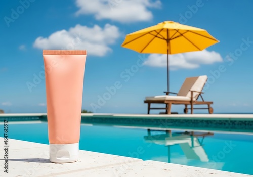 Sunscreen tube by the pool with lounge chair and umbrella