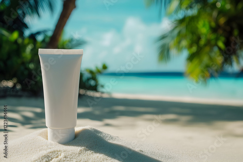 Sunscreen tube mockup resting on sandy beach with tropical backdrop and serene ocean view