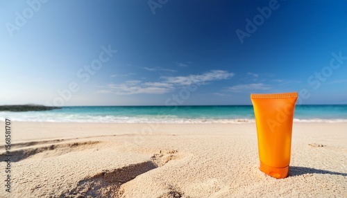 sunscreen tube on sandy beach with clear blue ocean in the background perfect for summer relaxation