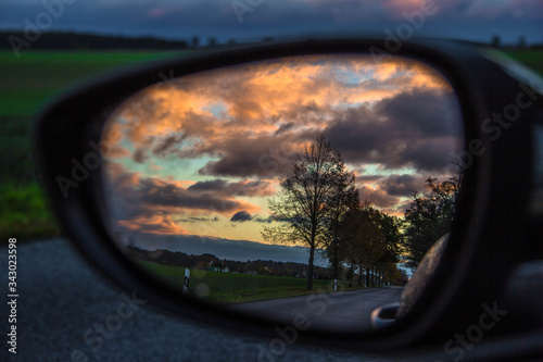 mirror, car, road, view, driving, speed, drive, travel, heaven, backview, rear, highway, countryside, traffic, transport, side, car, automobile, move, window, cloud, sunset