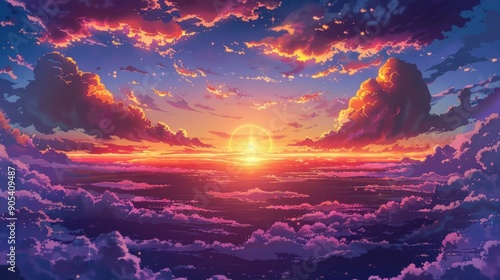 sunset, cloud, sky, orange, pink, purple, gold, horizon, sun, warm, vibrant, beautiful, nature, landscape, dramatic, heaven, heavenly, peaceful, serene, majestic, dreamy, fantasy, art, illustration, digital, painting, abstract, atmosphere, light, glow, ray, shining, bright, colours, palette, texture, depth, distance
