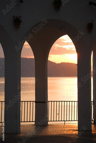 sunset, architecture, balcony, ocean, beach, water, view, sea, building, mountain, day, sun, holiday, vacation, empty, get-away, sunshine, terrace, architectural, arch, ocean view, archway, natural, background, summer, nature, outdoors, travel, landscape, relaxing, nobody, sky, morning, relax, colourful, relaxed, break, trip, traveling, earth, hospitality, tropical, cloud, sunrise, sunlight, island, gold