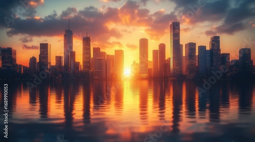 sunset, city skyline, skyscraper, water, calm water, sunlight, orange sky, cloud, city landscape, tall building, city landscape, evening, dusk, modern architecture, serene, peaceful, glowing, light, shadow, yellow sky, waterfront, urban, twilight, sun, downtown, city lights, water surface, metropolis, scenic, evening sky, calm, cloudscape, tranquil