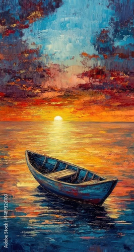 sunset, boat, sea, ocean, sky, cloud, colourful, vibrant, calm, peaceful, tranquil, serene, water, sunrise, dusk, evening, horizon, landscape, nature, artwork, painting, art, illustration, picturesque, beautiful, idylli, romantic, solitude, stillness, calmness, peace, serenity, summer, travel, vacation, holiday, relaxation, escape, dreamscape, mood, atmosphere, golden hour, nautical, marin, coastal, waterfront