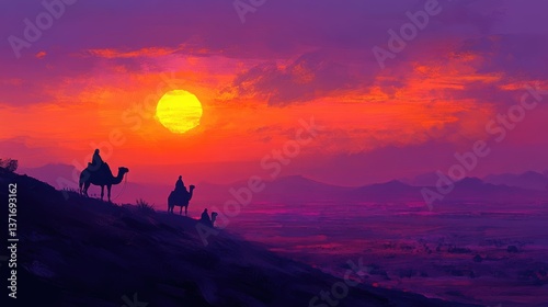 Sunset Camel Caravan: A breathtaking painting captures the silhouettes of a camel caravan against a vibrant sunset sky. the colors create a dramatic and stunning scene.