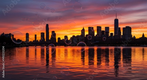 Sunset Cityscape with Floating Bubbles - Serene cityscape sunset, bubbles floating over water, reflecting city lights, symbolizing dreams, hope, peace, tranquility, and fleeting moments