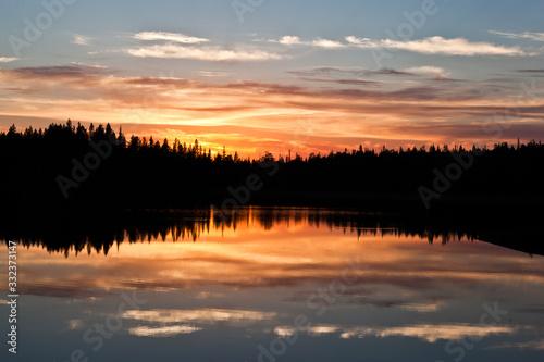 sunset clouds are reflected in the calm mirror water of the lake