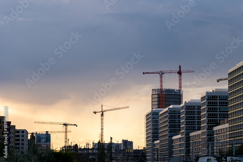 skyline, crane, city, urban, construction, sunset, cloud, architecture, development, berlin, dusk, twilight, horizon, panorama, city landscape, metropolis, district, building, tower, skyscraper, silhouette, backlit, dramatic, weather, stormy, evening, light, orange, blue, contrast, investment, growth, progress, infrastructure, engineering, crane, worksite, highrise, residential, office, business, europa, german, capital, modernization, expansion, urbanism, landscape
