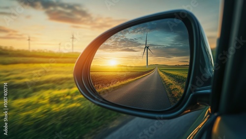 sunset, road, windmill, energy, mirror, car, drive, landscape, rural, field, green, yellow, gold, sky, cloud, nature, travel, journey, horizon, view, scene, summer, evening, motion, blur, speed, clean, eco, friendly, sustainable, renewable, power, technology, future, progress, environment, countryside, transport, automotive