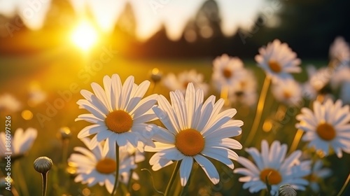 Sunset glow on white daisy field golden hour scenery with blooming flowers in blurred meadow