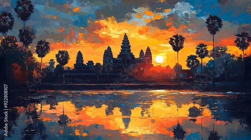 sunset, sky, sunrise, sun, cloud, water, nature, lake, landscape, tree, cloud, red, silhouette, dusk, orange, evening, tree, river, beautiful, angkor wat, forest, temple, morning, pink, sea, color image, photo, background, no people, illustration, beach, art, summer, travel, sunlight, outdoors, people, abstract, vacation, creativity
