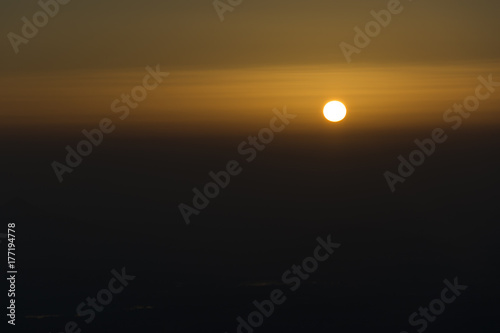 Sunset hot yellow and red sky. Sun is hidding behind clouds.