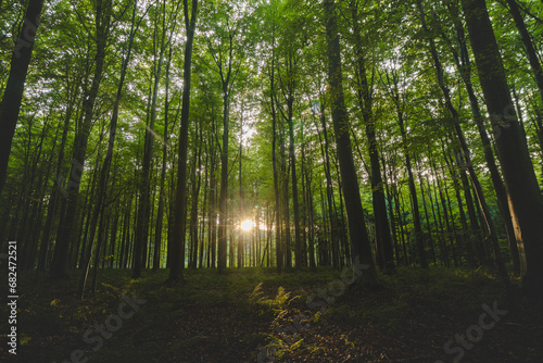 Sunset in a pristine deciduous forest in Hallerbos, Brabantse Wouden National Park, Belgium