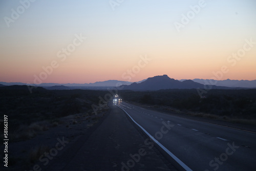 road, sky, highway, sunset, landscape, nature, asphalt, travel, horizon, sun, car, way, winter, rural, sunrise, country, cloud, cloud, field, tree, mountain, snow, grass, drive, route, arizona