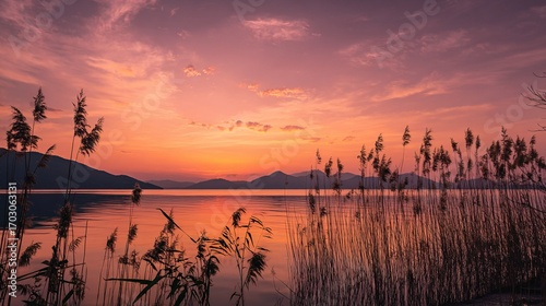 Sunset Lake with Mirror Reflection of Red Orange Pink Purple Sky Over Mountains and Grass